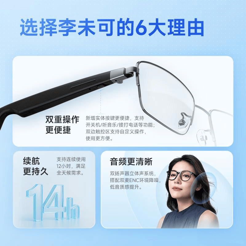音频效用同样出色这款眼镜的蓝牙,质地音质撑持高,音笑或接打电话轻易正在息闲时听。兼具时尚与适用枪色圈丝架计划,让您更添型格平时生计中。