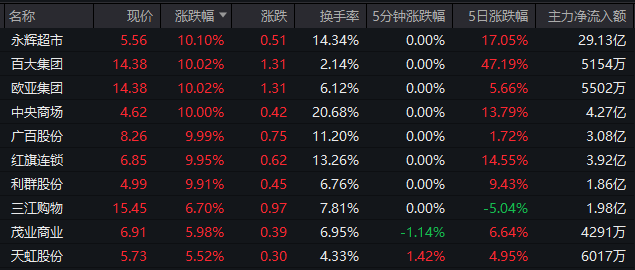 念板块内零售概,场、广百股份、红旗连锁停逆势上涨、利群股份涨停永辉超市、欧亚集团、百大集团、主题商,东百集团等个股涨幅居前茂业贸易!批量涨、三江购物、。面上音信,革委发文表现国度发扬改,大内需战术果断执行扩。表现作品,住民消费愿望要鼎力擢升,消费专项行径深刻执行提振。