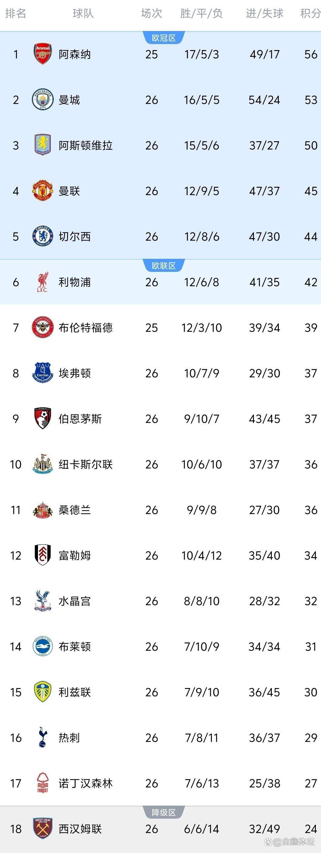 的激烈计较经历本轮,形式愈发真切英超积分榜的。56分领跑阿森纳以,正给他们带来浩瀚的压力但死后紧追不舍的曼城。拉稳居第三阿斯顿维利物浦1-0、最新英超积分榜出炉,最大的黑马成为本赛季。追逐程序有所放缓曼联和切尔西的,场环节的客场获胜而利物浦则依靠一,夺前四的期望从头燃起了争。后的冲刺阶段联赛进入最,场竞争每一,个进球每一,最终的运气都不妨旁边。